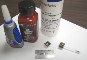 Photo 1 and 2: Parts and tools include: glass capillaries (WPI 1B120F-4), super glue, insulating varnish (GC electronics 10-9002), DIP connector, razor blade, tweezers and precision scissors can help. Fine tungsten or stainless steel is used (diam 25-50 µm, here 0.0015 inches from California Fine Wire Company), better when it comes with an insulating coating (teflon or polyimide). The electrode to be replaced is shown for for dimensions.