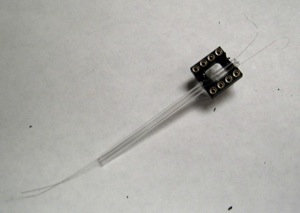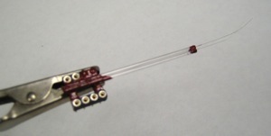 Photo 5: Gently pull wires from the tip of electrode to minimize length on the connector side. A drop of super glue helps keep the wire in place. Cover contact areas on the connector side and at the tip of the capillaries with insulating varnish. Let dry overnight.