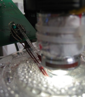 Photo 3: Cut capillaries to length. Scratch connector with razor blade so glue will stick well. Glue capillaries (here it’s a double electrode). Insert fine wires in capillaries. Scratch wires with razor blade to remove insulator, only on the side close to connector (wires get curly).
