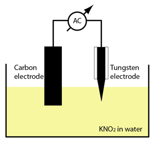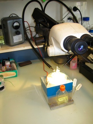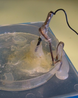 Photo 7, 8 and 9: etching the tip of the electrode is an optional further step. It is useful for electrodes made out of uninsulated tungsten wire, providing a longer recording tip. In this case the electrode is assembled as shown in photos 1-6, but the wire used is not coated or the the coating has been removed by gently scrubing an insulated wire. After assembly is completed, a current is passed through the tip of the electrode as it stands in an etching solution (KNO2, 5M). An adjustable AC power supply (0-5V, 500mA) is connected on one side to the electrode and on the other side to a carbon electrode. The etching bath is made out of a 2ml eppendorf tube attached in the center of a Petri dish. The carbon electrode is made with a pencil lead and connected through a 2mm female connector held in place above the eppendorf by a modified paperclip. The tungsten electrode assembly connects through an alligator clip and is gently moved up and down under visual control to carve a fine tip. The procedure can be repeated each time the electrode tip requires sharpening. Insulating varnish can be applied with a brush or removed by dipping the tip of the electrode in a solvant solution. Coating drying time is typically overnight at room temperature and shorter with an hot air dryer. IMPORTANT: Rince electrode under tap water, then saline, since KNO2, varnish residues and solvants are toxic to cells.