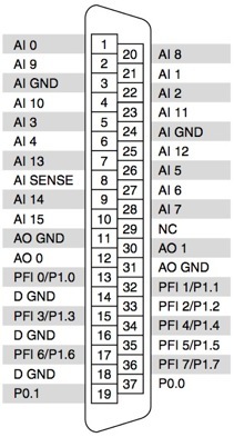Photo 9 and 10: Acquisition boards have high density connectors while amplifiers often output signal to BNC plugs, which calls for an adapter between the two systems. The example show here is designed for a National Instruments PCI-6221 M series board with a D-sub 37 pin connector. D-sub pins must be properly wired to the BNCs core and ground. Board pinout is given by the manual ("DAQ M Series/M Series User Manual"), as shown on diagram. For single ended input all BNC grounds are connected to the analog input ground (AI GND), while BNC core contacts are connected to analog inputs (AI0, AI1, AI2...). Alternative wiring uses differential mode input by hooking the first BNC core and ground to AI0 and AI8, second BNC to AI1 and AI9, etc. Software acquisition mode should be set according to the wiring scheme, single ended or differential.